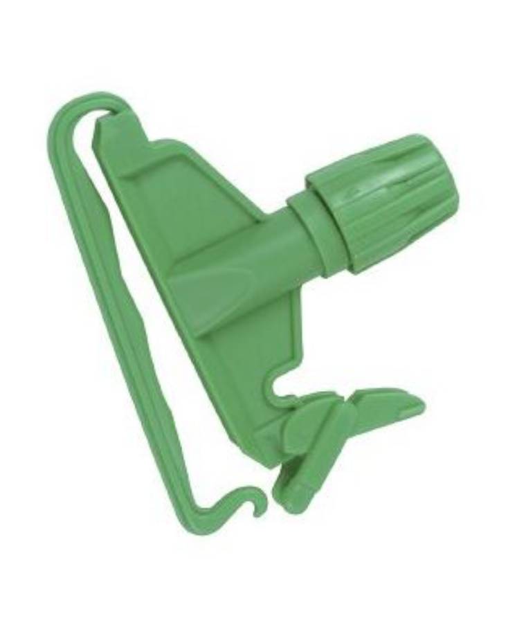 The Green Kentucky Mop Clip is engineered for professional cleaning needs, offering a tight, secure hold between the mop handle and mop refill. Its robust design ensures dependable performance in busy cleaning environments.